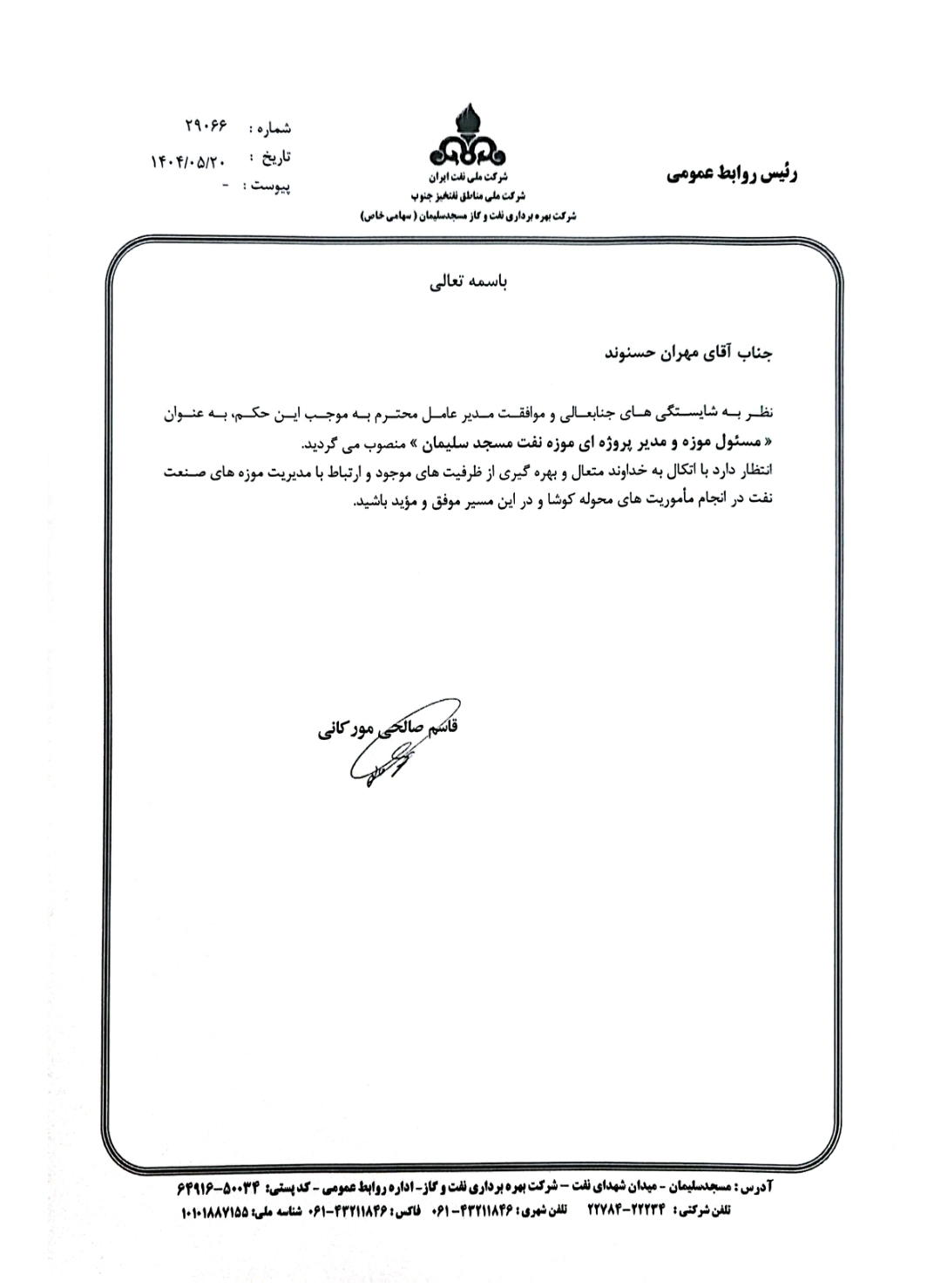 ایلبانگ : طی حکمی از سوی قاسم صالحی رئیس روابط عمومی شرکت بهره برداری نفت و گاز مسجدسلیمان مهران حسنوند به عنوان مسئول جدید موزه و مدیر پروژه موزه نفت مسجدسلیمان معرفی شد. به گزارش پایگاه خبری ایل بانگ پیش از این فرید کاوش عهده دار این مسئولیت بود.